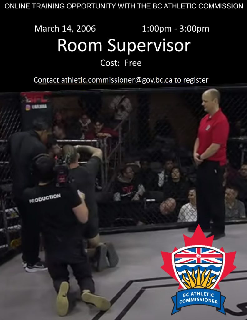 The British Columbia Athletic Commissioner oversees the conduct of professional boxing, kickboxing and mixed martial arts (MMA) as well as all amateur combat sports events throughout the Province of British Columbia. The Athletic Commissioner is committed to ensuring the safety and integrity of combat sports in the Province.